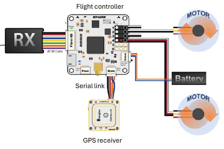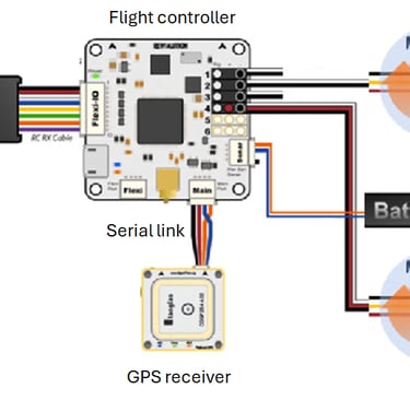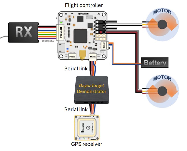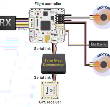 To use BayesTarget Demonstrator just insert it between the GPS receiver and the drone flight controller. BayesTarget feeds coordinates to the flight controller just as the GPS receiver would, but when the GPS signal becomes unreliable it replaces the GPS coordinates with its own calculations based on digital waypoints imaged by its 16MP camera.
